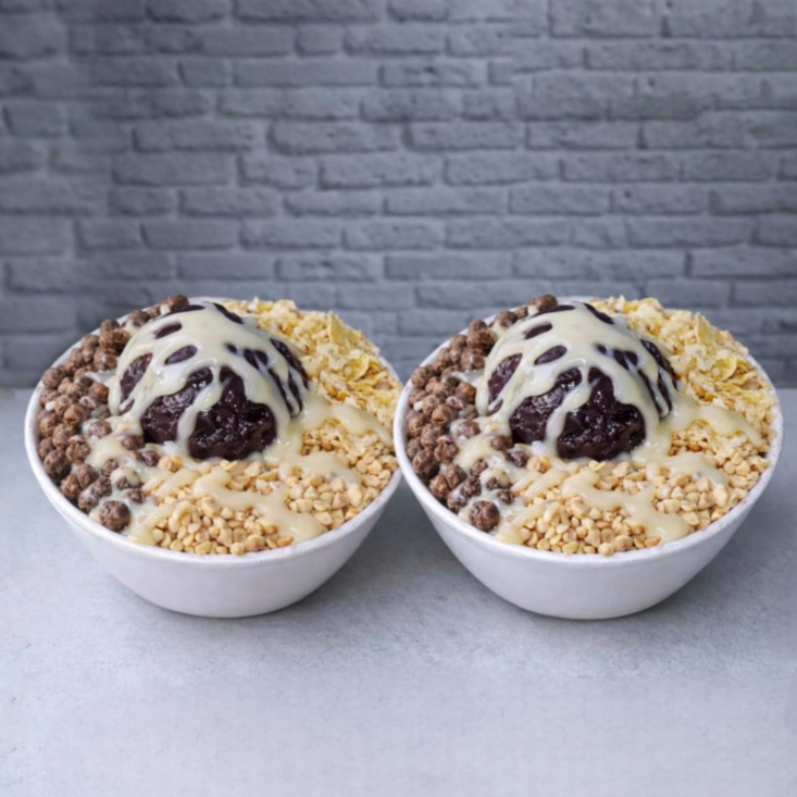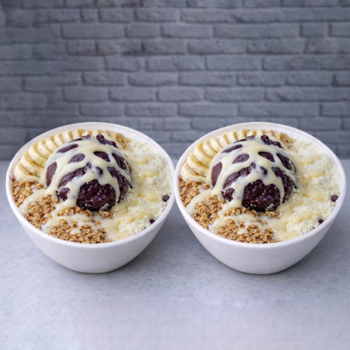 2 açaís 300ml cremosos com granola, banana, leite em pó e leite condensado.