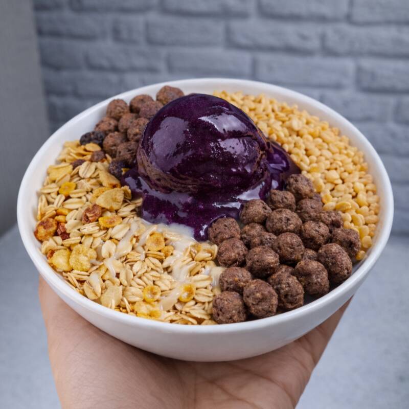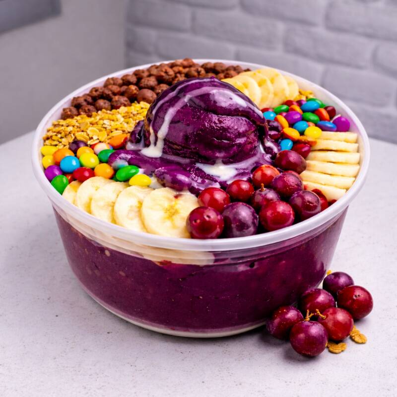 700ml de açaí cremoso com frutas e até 5 complementos grátis.
