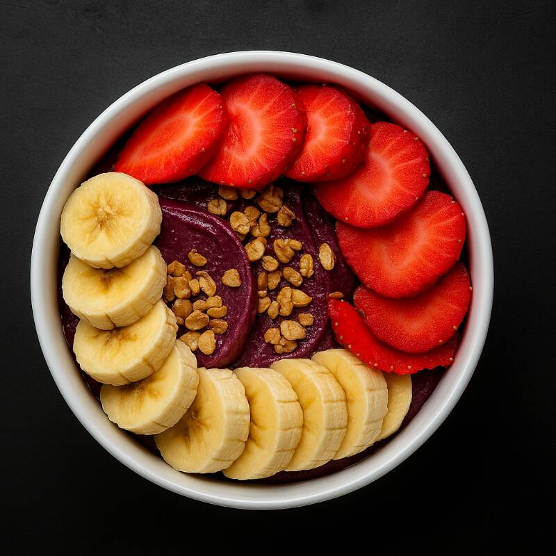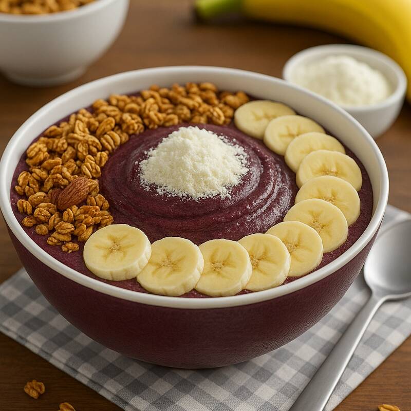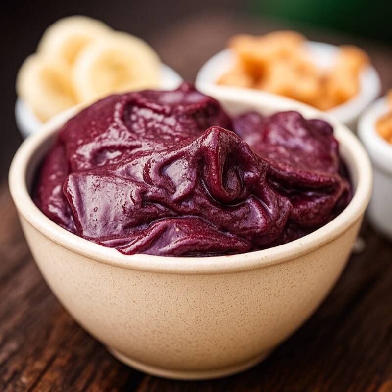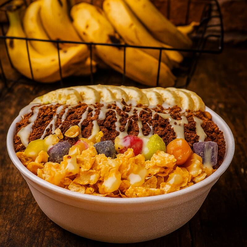 Açaí 500ml, super cremoso com granola, leite em pó, banana e leite condensado.