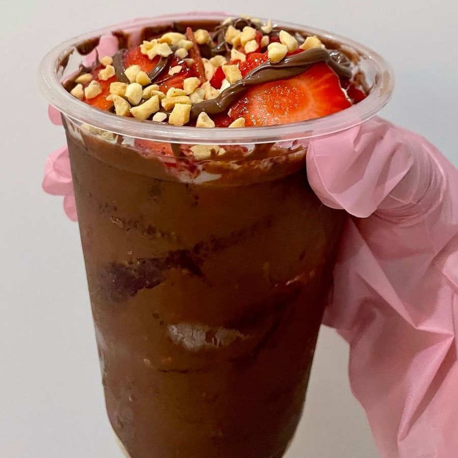 Nosso copo da Tpm é o famoso Açaí Trufado, com a opção de ser Chocolate Preto, Branco ou Nutella. Podendo escolher 1 frutas e 2 complementos de sua preferência!