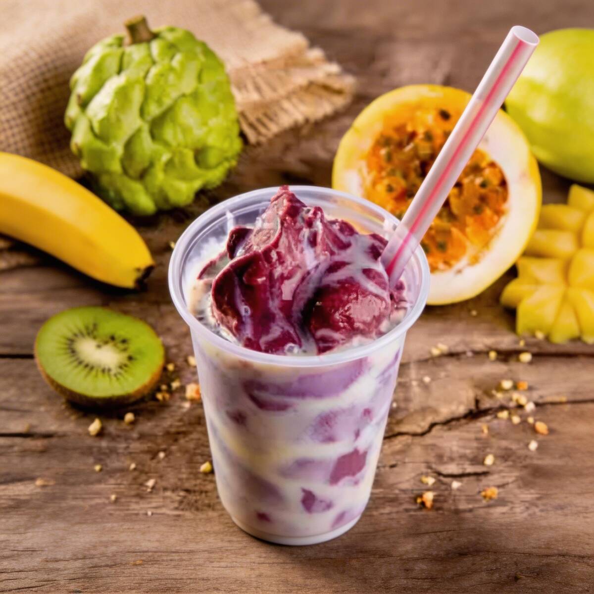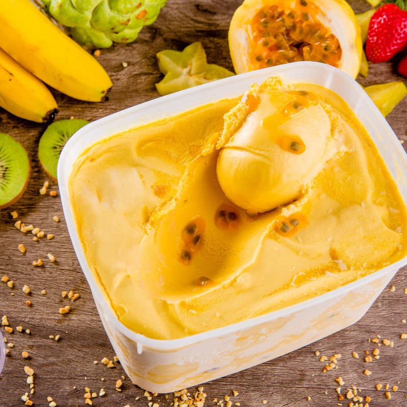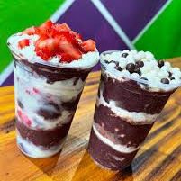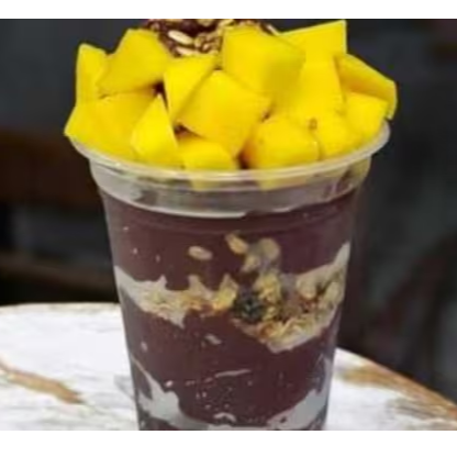 Açaí, leite condensado, leite em pó, granola, manga e sorvete de cupuaçu.