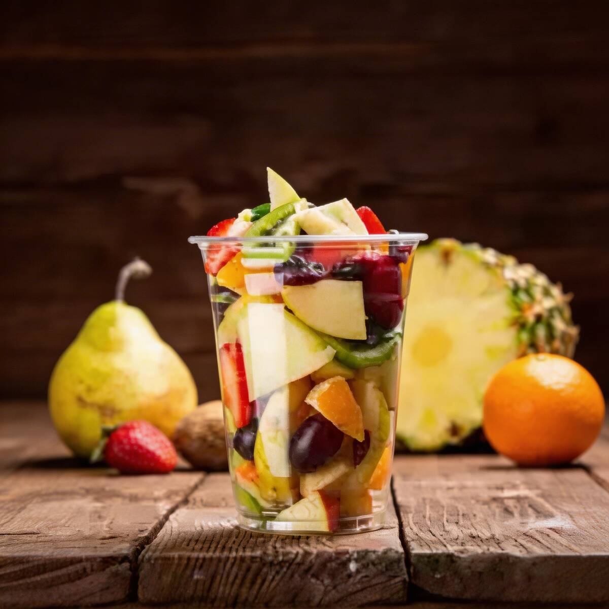 Salada de frutas deliciosa, feita com frutas da época fresquinhas, cortadas na hora no copo de 300ml. Imagem Ilustrativa