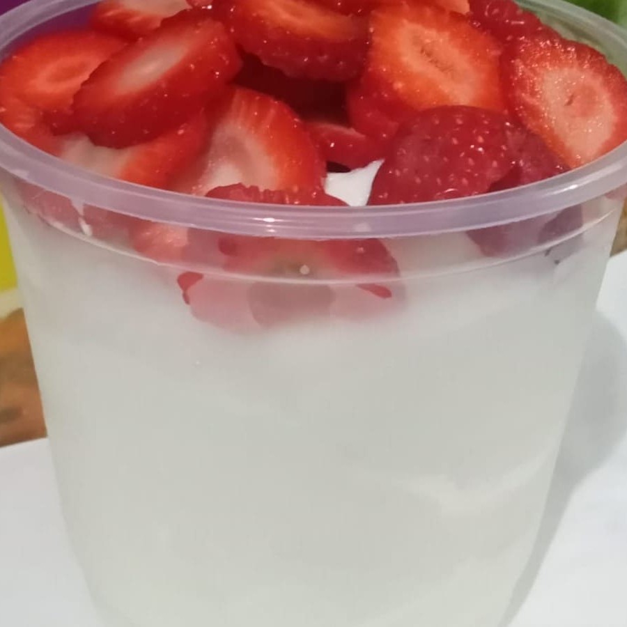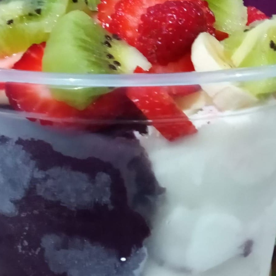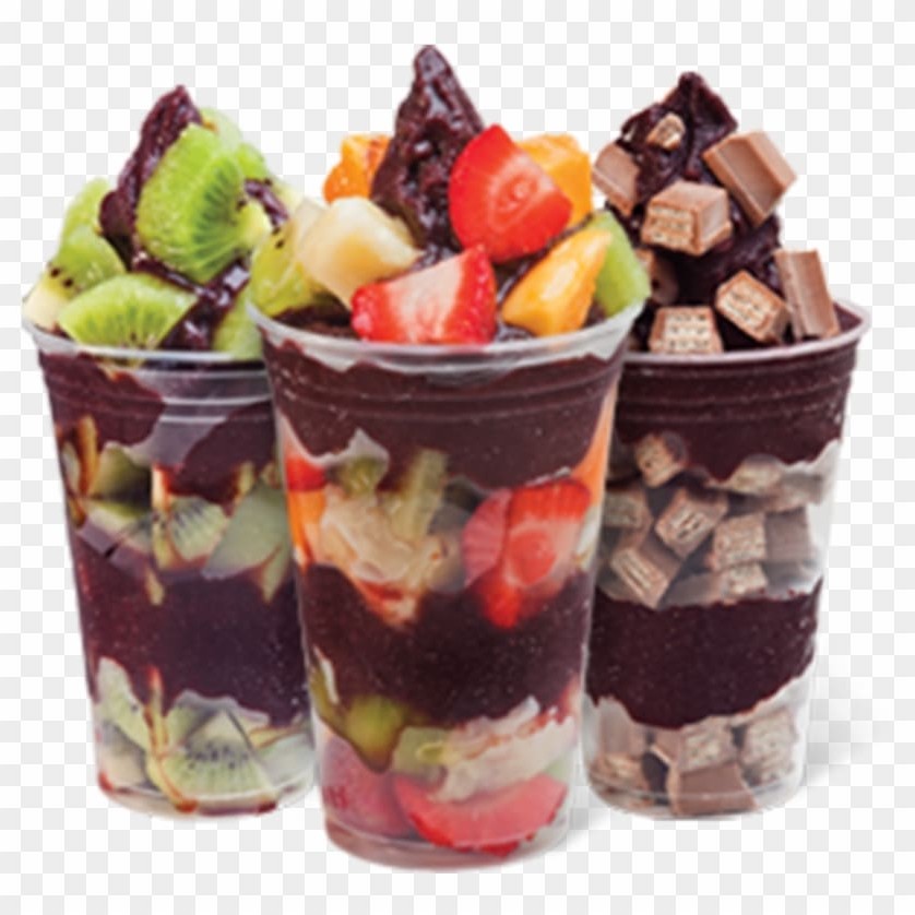 Açai tradicional montado com os acompanhamentos dentro do pote.