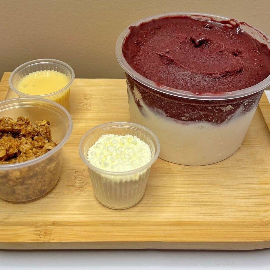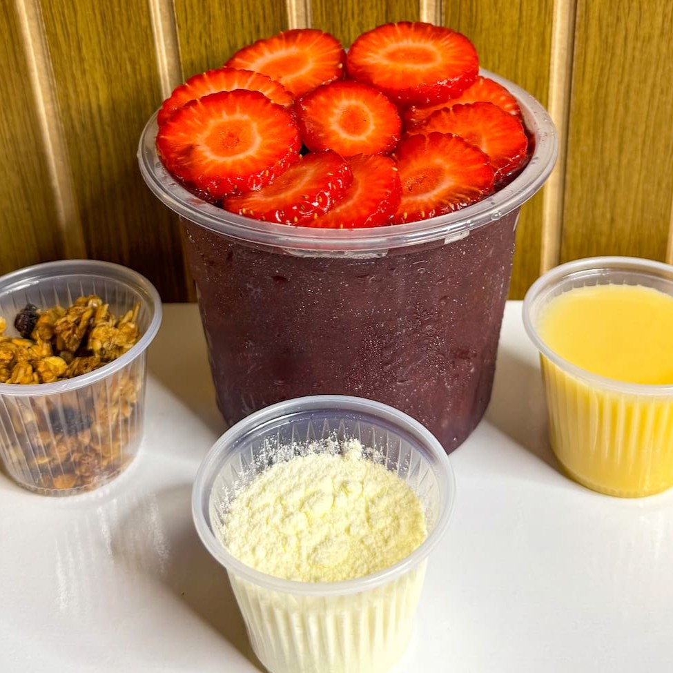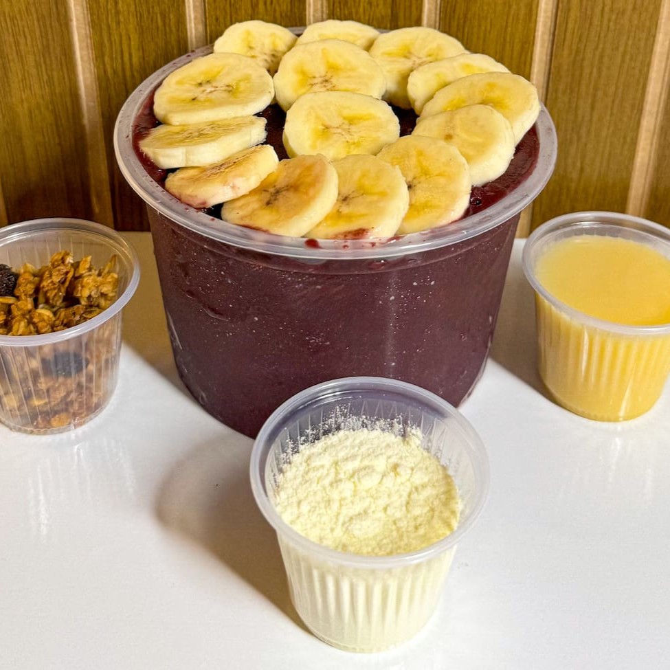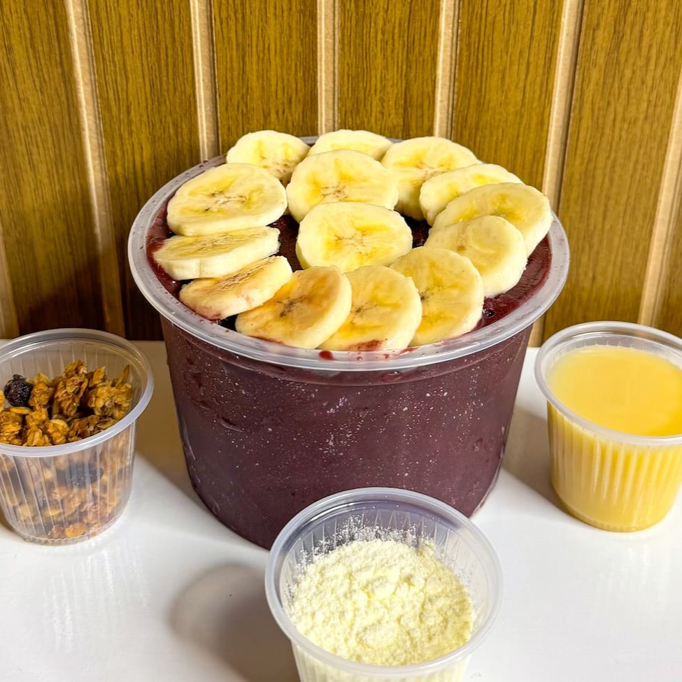 Açaí com leite condensado, leite em pó, granola e 1 fruta à sua escolha. Simples e delicioso!