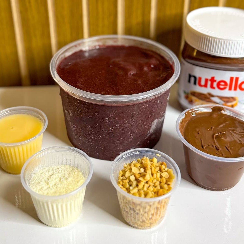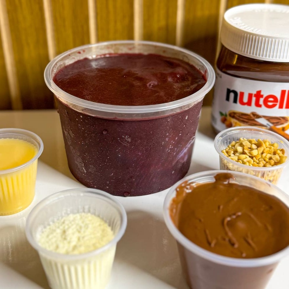 Açaí no ponto, acompanhado com Nutella de verdade, leite em Ninho, amendoim crocante e aquele leite condensado que derrete na boca. A combinação preferida da galera.