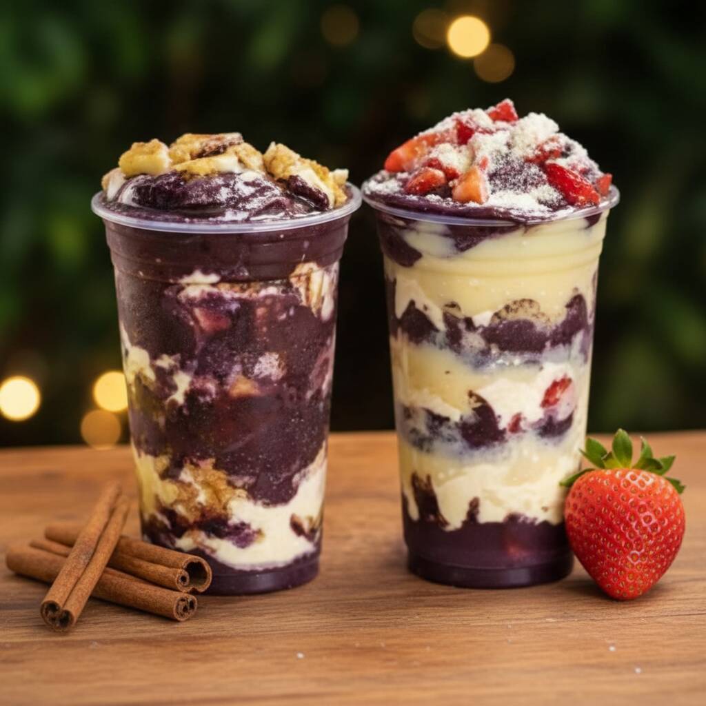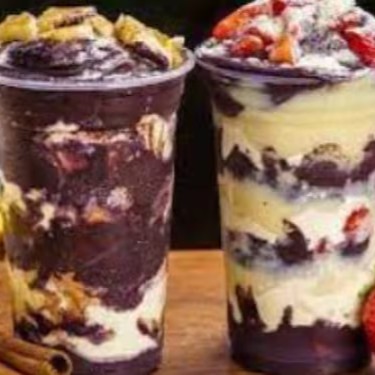 Metade com Acaí e metade com cupuaçu adicionado aos complementos que voce quiser.