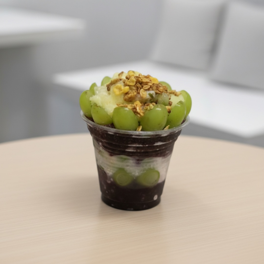 Delicioso e refrescante Açaí com uva verde e complementos que você desejar.
