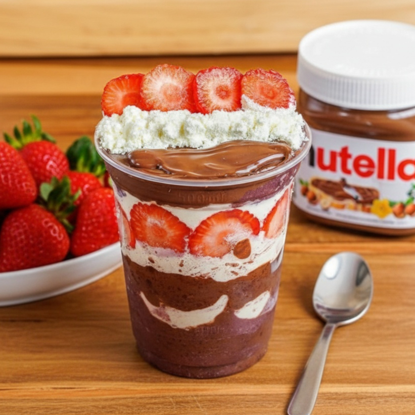 Delicioso açaí Trufado com Nutella nas laterais do copo , uma camada no meio e mais uma porção em cima , e vc ainda pode escolher mais 3 complementos tudo incluso !!!