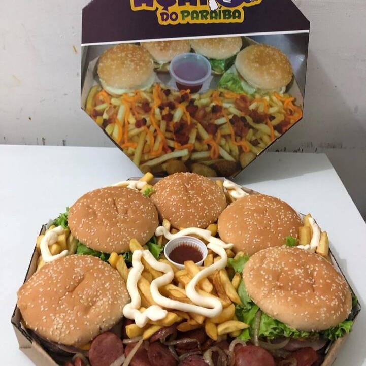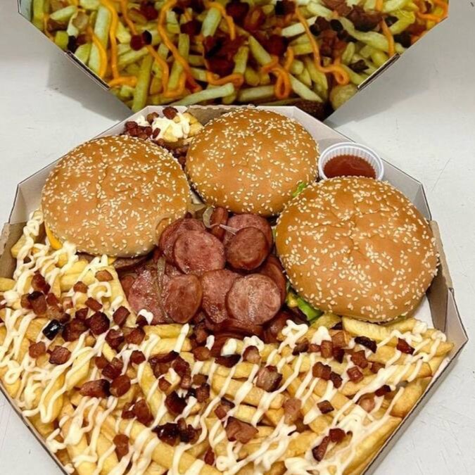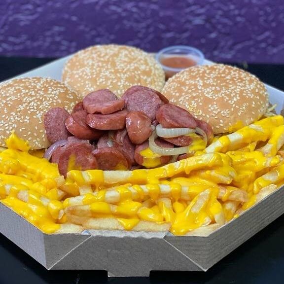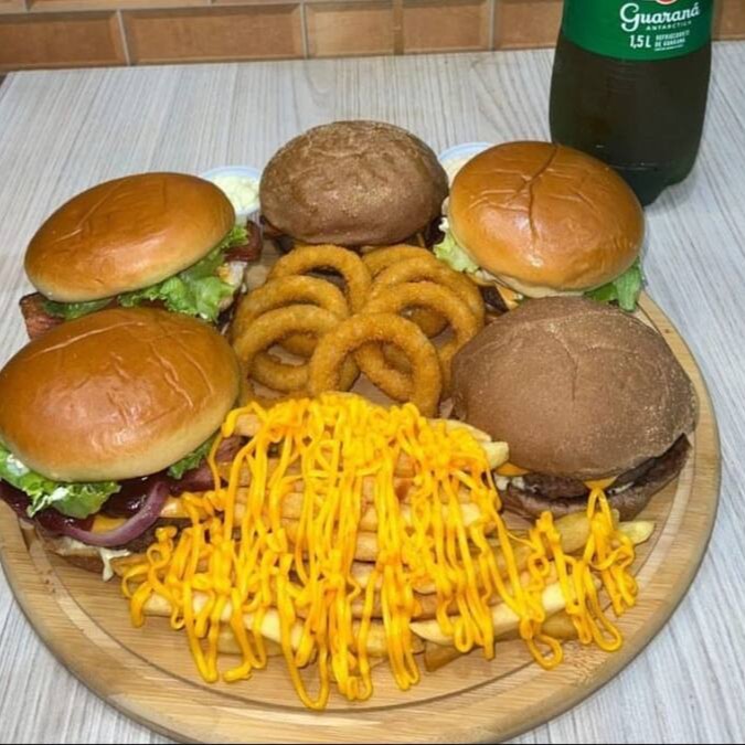 3 lanches a sua escolha, Batata com Cheddar, Catupiry ou Bacon e Calabresa ou anéis de cebola e um refrigerante de brinde.