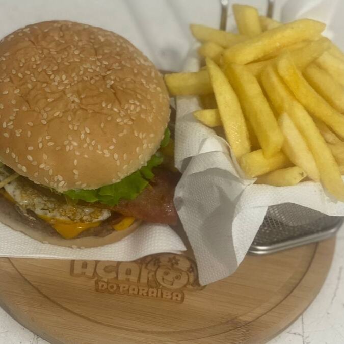 Pão Mônaco, 2 hambúrguer de 90g, queijo, maionese e batata palha.