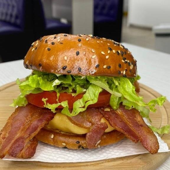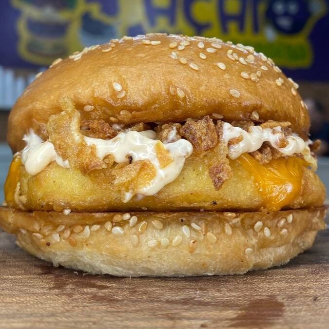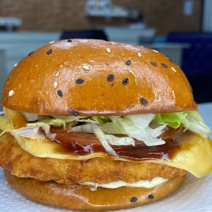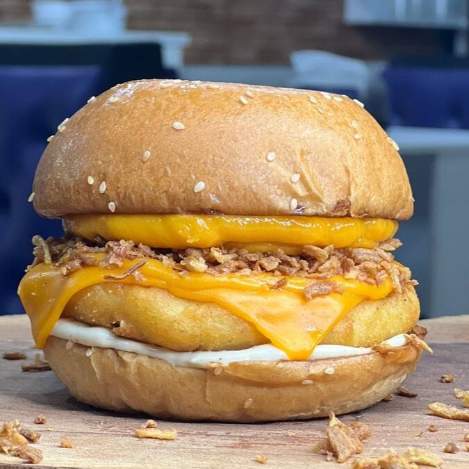 Pão Brioche, Hamburguer de Frango 90g, Fatia de queijo Cheddar,Cebola Crispy, Maionese de Bacon e maionese caseira.