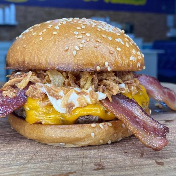 Pão Brioche, Carne 150g, Fatia de queijo cheddar, Bacon, Maionese de Bacon, Cebola Crispy, e maionese caseira.