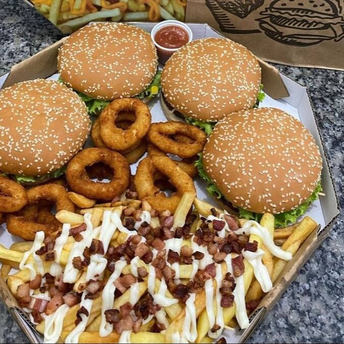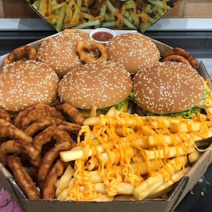3 lanches a sua escolha com carne de 150g, Batata com cheddar ou Catupiry, Calabresa ou anéis de cebola e um refrigerante de brinde.