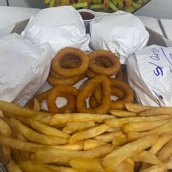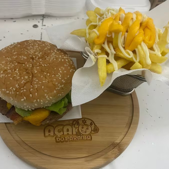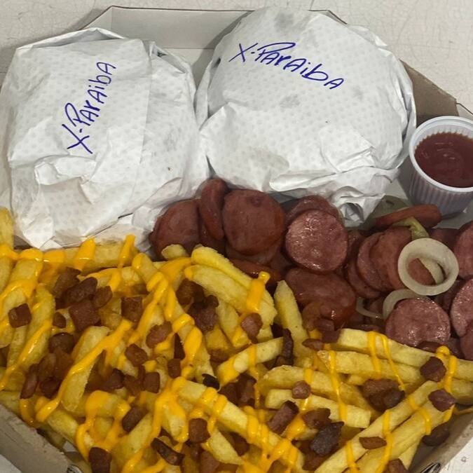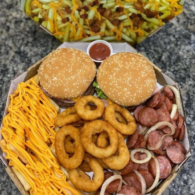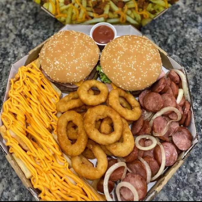 São Dois lanches a sua escolha, Batata Frita com Cheddar ou Catupiry, Calabresa ou anéis de cebola e opcional de Bacon na Batata.