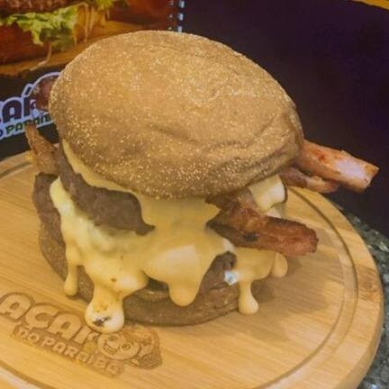 2 Hambúrguer Artesanal de (150g), molho de Cheddar, fatias de bacon, molho especial, Pão Brioche selado na manteiga.