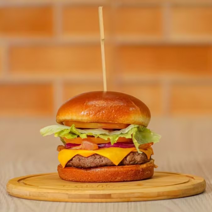 Hambúrguer Artesanal (150g), queijo cheddar, alface, tomate, cebola roxa, maionese temperada, Pão de brioche selado na manteiga.