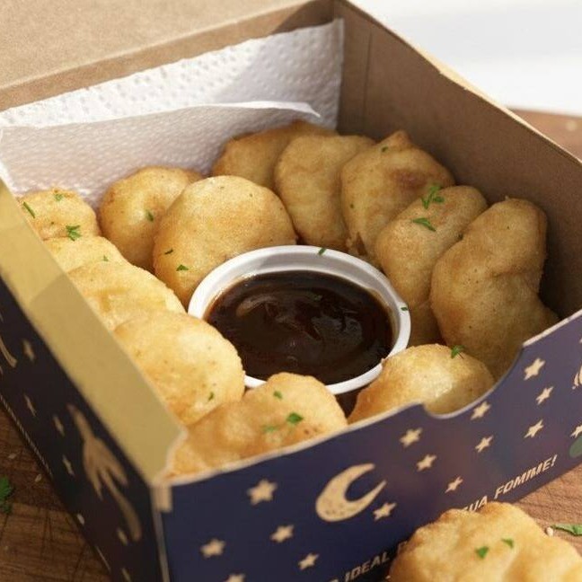 10 unidades de um delicioso nuggets de frango com molho Barbecue.