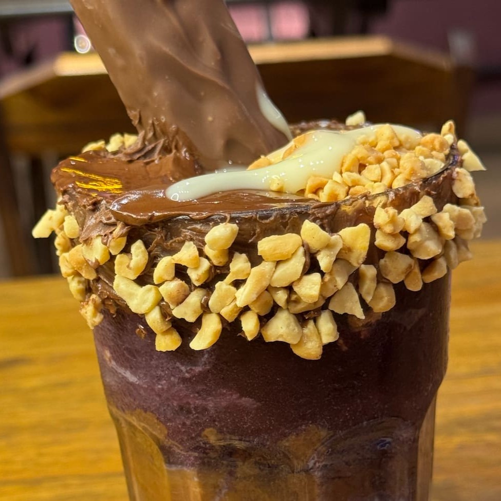 Este deleite é uma combinação esplêndida de açaí autêntico, generosamente coberto com leite condensado doce e cremoso. Apresenta uma borda deliciosamente espessa de Nutella, com uma surpresa interior de amendoim crocante. A cereja do bolo é a cobertura final de Nutella e amendoim, adicionando uma camada adicional de sabor irresistível. Para completar a experiência gastronômica, o prato é acompanhado por um chocolate Snickers. Uma indulgência verdadeiramente decadente e irresistível que promete satisfazer todos os seus desejos doces. Acai Açaí Açaís