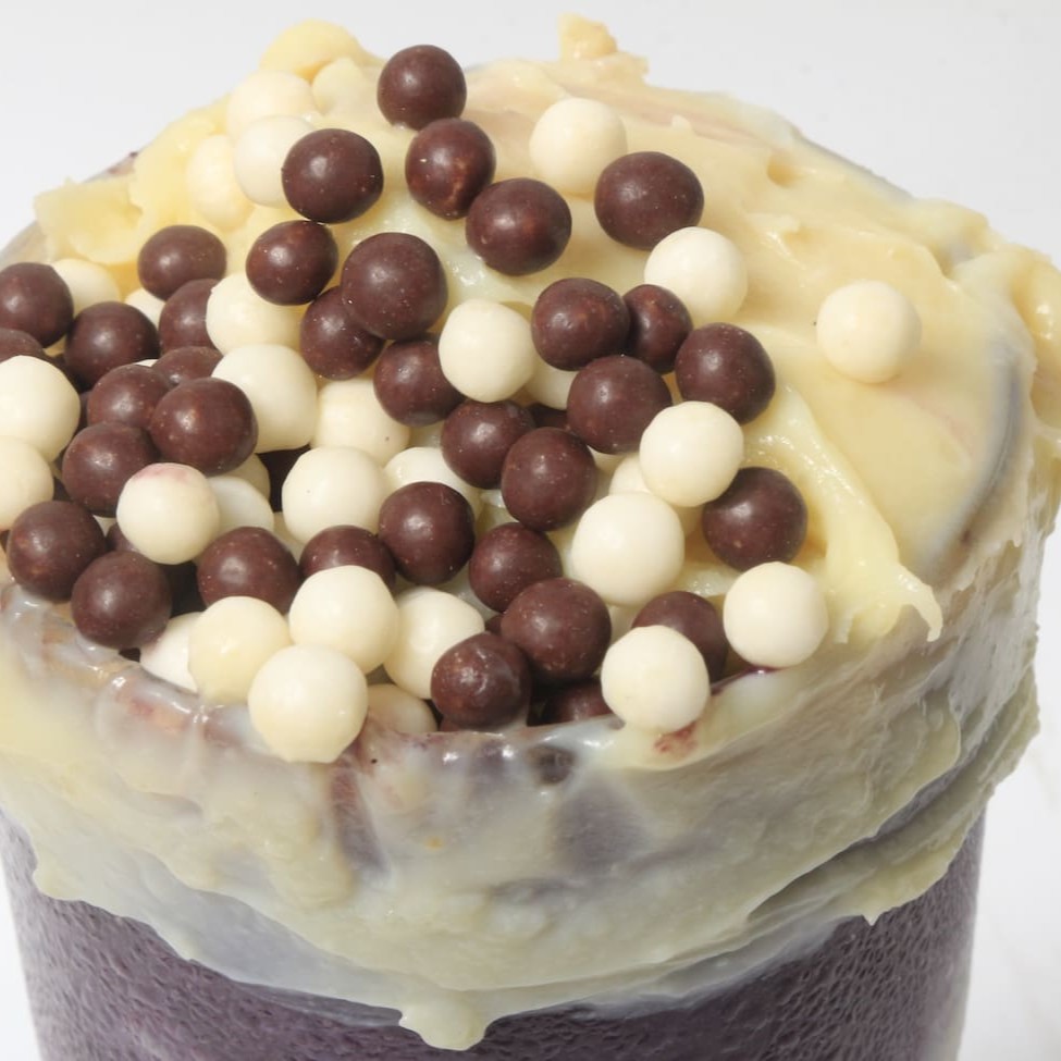 Unimos a cremosidade do açaí, com o doce envolvente do leite condensado. A borda interna é generosamente recheada com o irresistível Laka, proporcionando uma explosão de sabor. Acrescentamos, ainda, o rico recheio de Chocoball, que traz uma surpresa crocante a cada colherada. Finalizamos com o recheio Galak/Galak Negresco, um contraste perfeito de sabores cremosos que vai te encantar. Uma combinação perfeita para os amantes de açaí e chocolate branco.