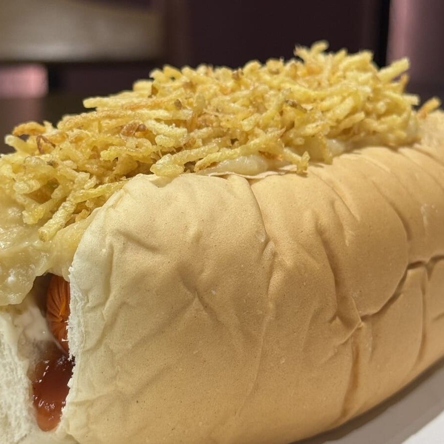 Pão de hot-dog, salsicha, milho, maionese, Ketchup, mostarda, purê caseiro e batata palha.