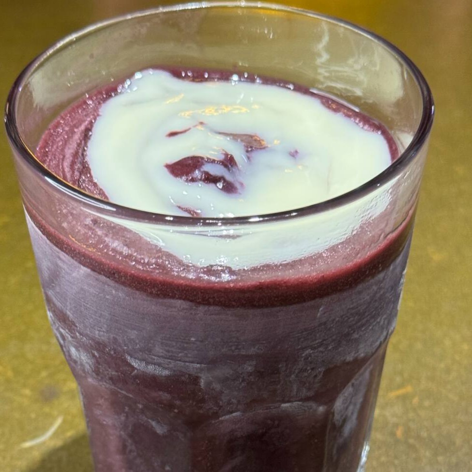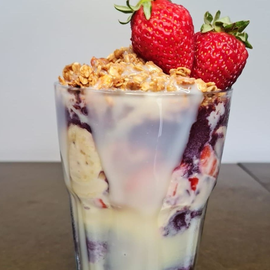 Açaí, leite condensado, leite em pó, duas frutas de sua escolha, e granola.