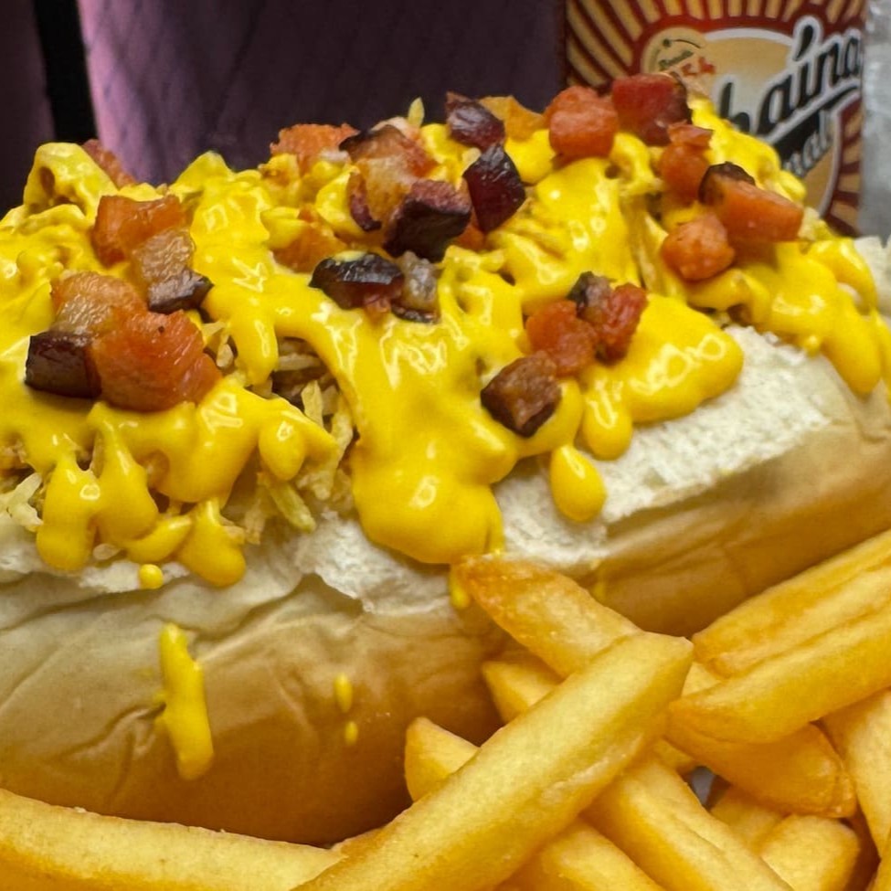 Pão de Hot-dog, 2 salsichas, milho, maionese, ketshup, mostarda, purê caseiro, batata palha, molho cheddar e Bacon.