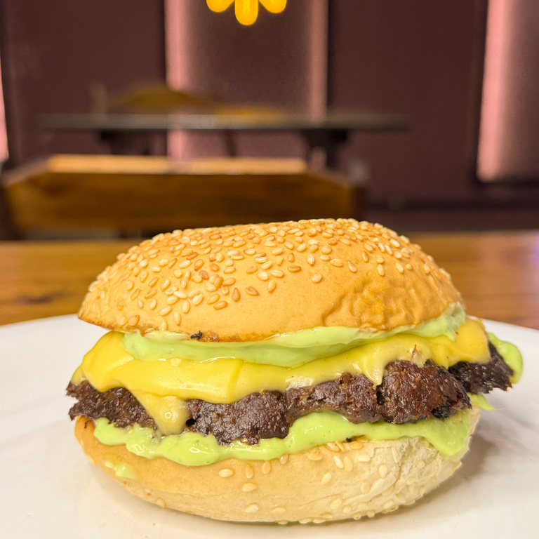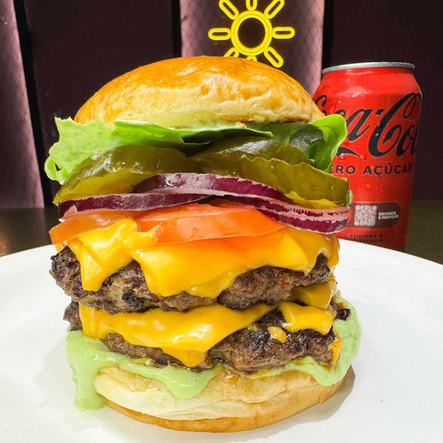 Pão brioche, 2 hamburgueres de 145g, queijo cheddar, tomate, alface, cebola roxa, picles e maionese verde.