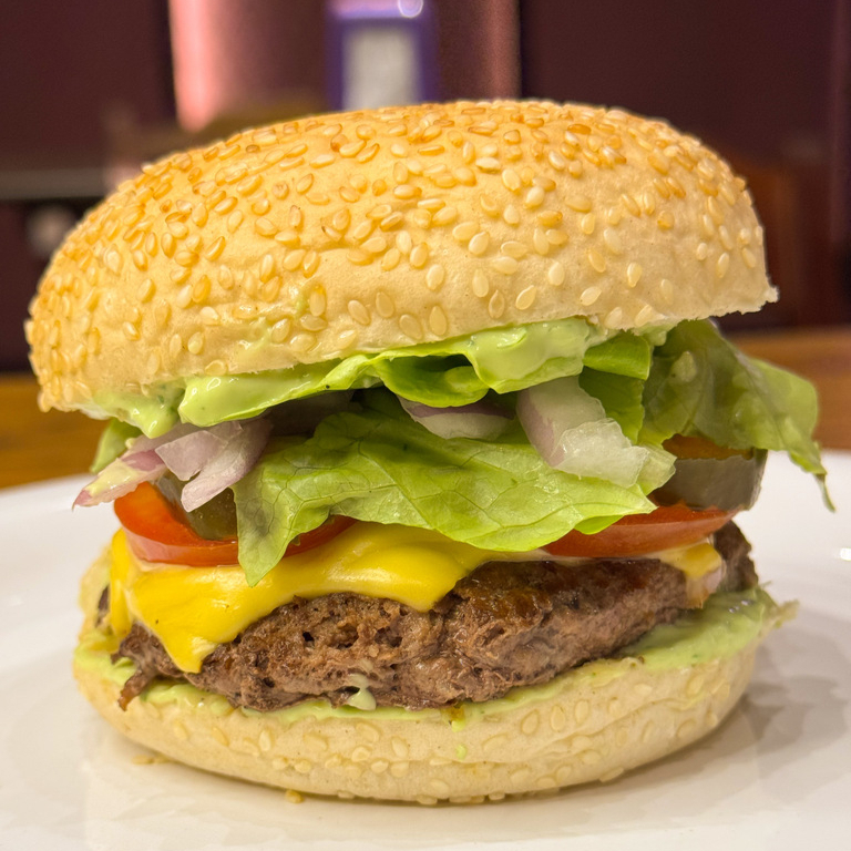 Pão com gergelim, hambuguer artesanal de 145g feito com carnes nobres, duas fatias de queijo prato, alface fresca, tomate, picles, cebola roxa e nossa maravilhosa maionese verde.