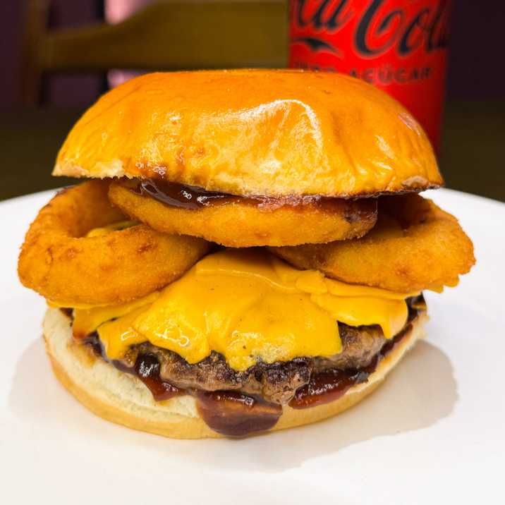 Pão briohce fofinho, hambuguer artesamal de 145g feito com carnes nobres, duas laminas de queijo cheddar, tres onions rings, e um delicioso molho barbecue.