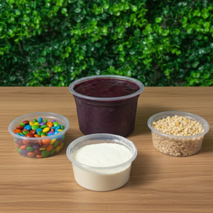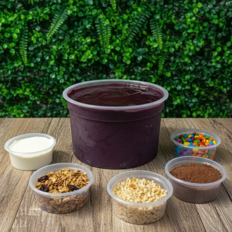 Desfrute de 1 litro do nosso delicioso e energizante Açaí Nutritivo, enriquecido com a autêntica e potente essência da Amazônia. Acompanha cinco irresistíveis opções de toppings de sua escolha, meticulosamente embalados em potes separados de 75 ml para manter sua frescura e sabor. Uma experiência gastronômica revigorante, repleta de nutrientes e sabor, aguarda por você. Torne seu Dia mais vibrante e produtivo com o nosso Açaí Nutritivo!