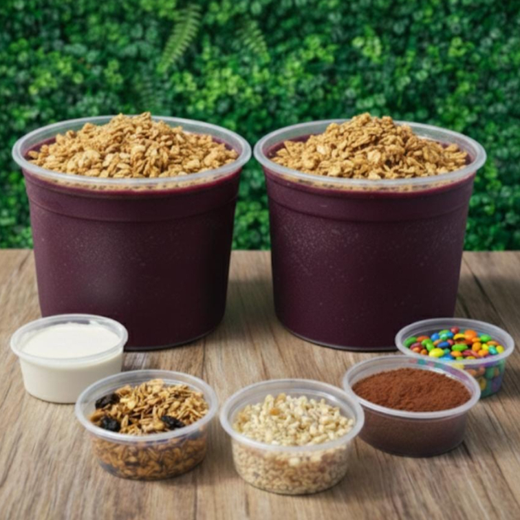 Delicie-se com nosso generoso Açaí de 750 ml, repleto de sabor e nutrição! Este prato é parte de nossa categoria 'Açaí Nutritivo!'. Para aprimorar ainda mais a sua experiência, nós oferecemos quatro acompanhamentos gratuitos, cada um cuidadosamente embalado em seu próprio pote de 75 ml, mantendo a integridade e o frescor de cada componente. Uma proposta perfeita para quem busca uma refeição saudável sem abrir mão do sabor autêntico e irresistível do açaí.