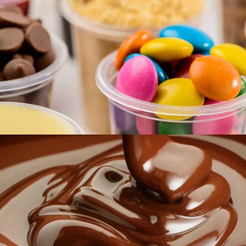 Fondue de chocolate, pote 300ml com frutas fresquinhas e 100ml de chocolate servido separado, escolha as frutas e acompanhamentos!