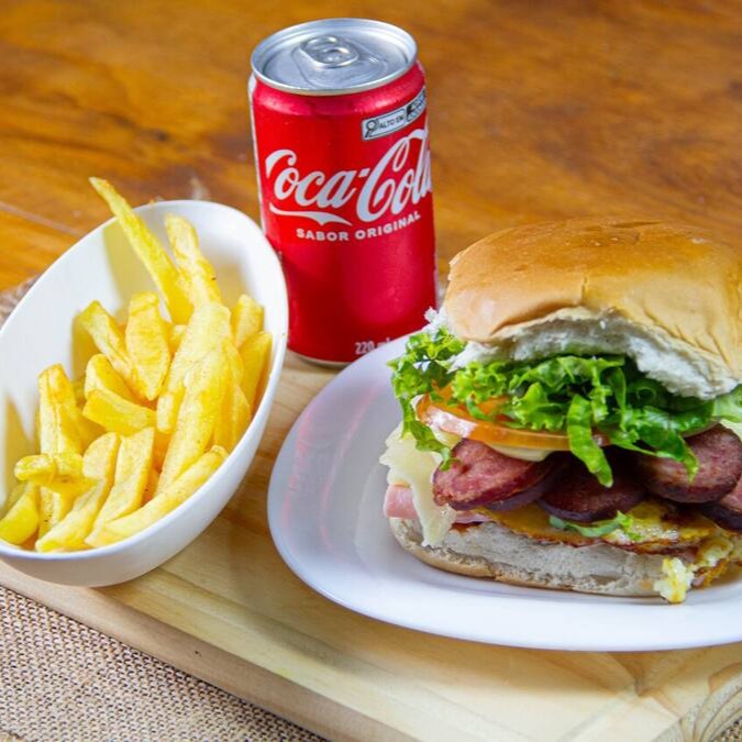 Combo acompanha 1 x -tudo + 200g batata simples + 1 refrigerante 220 ml lata coca cola, caso queira outro refrigerante, informe na observação do pedido ou no chat.