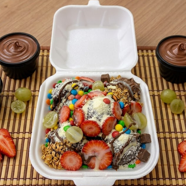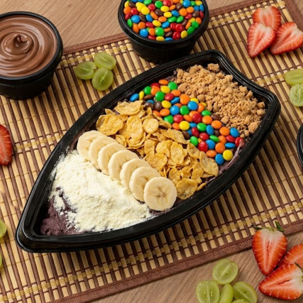 Açai cremoso com 4 bolas generosas de açai premium , 4 complementos grátis a sua escolha. (Imagem meramente ilustrativa).