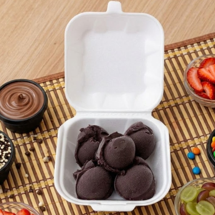 Açai grande cremoso são 8 bolas generosas de açai premium cremoso, com 4 complementos grátis.