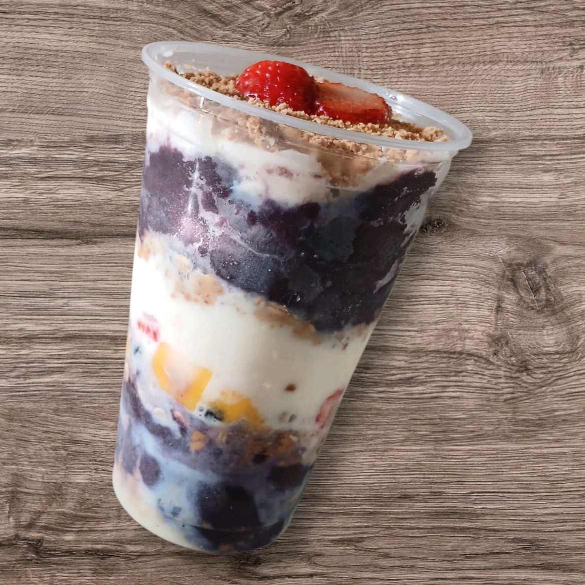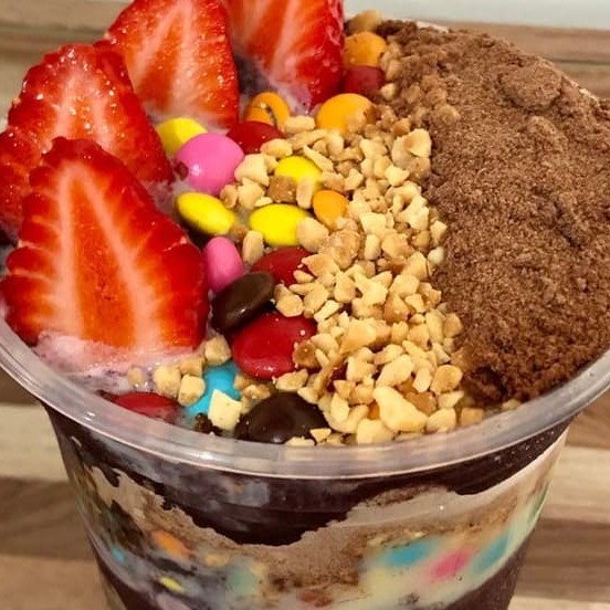 Escolha seus acompanhamentos entre eles: leite em pó, leite condensado, confete, sucrilhos, paçoca, granola, Ovomaltine, calda de caramelo, calda de chocolate, calda de morango, mel. Frutas: banana, manga, morango, uva.