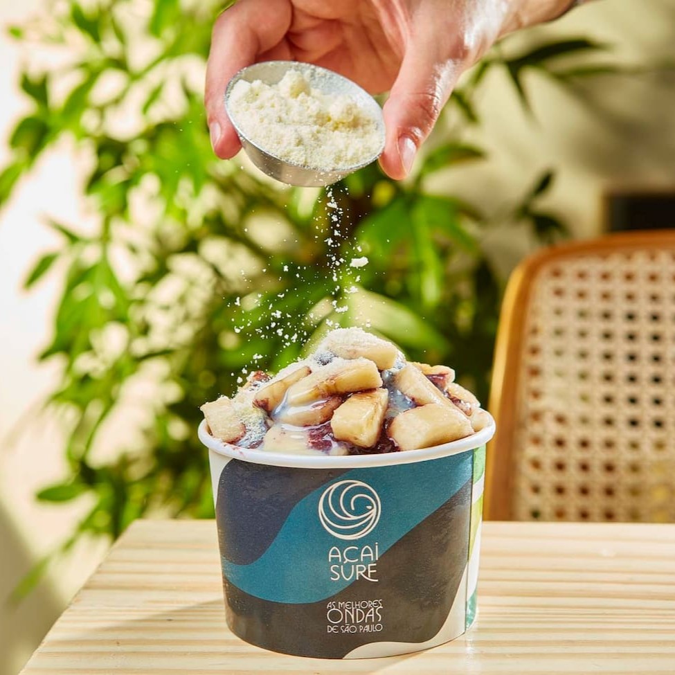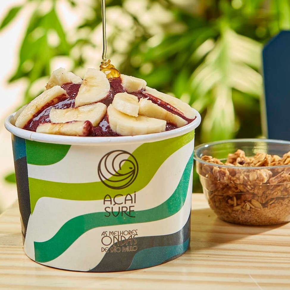 Açaí natural com duas camadas de leite em pó e leite condensado + banana fatiada! O mais pedido!