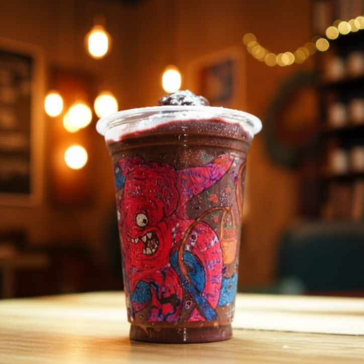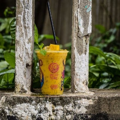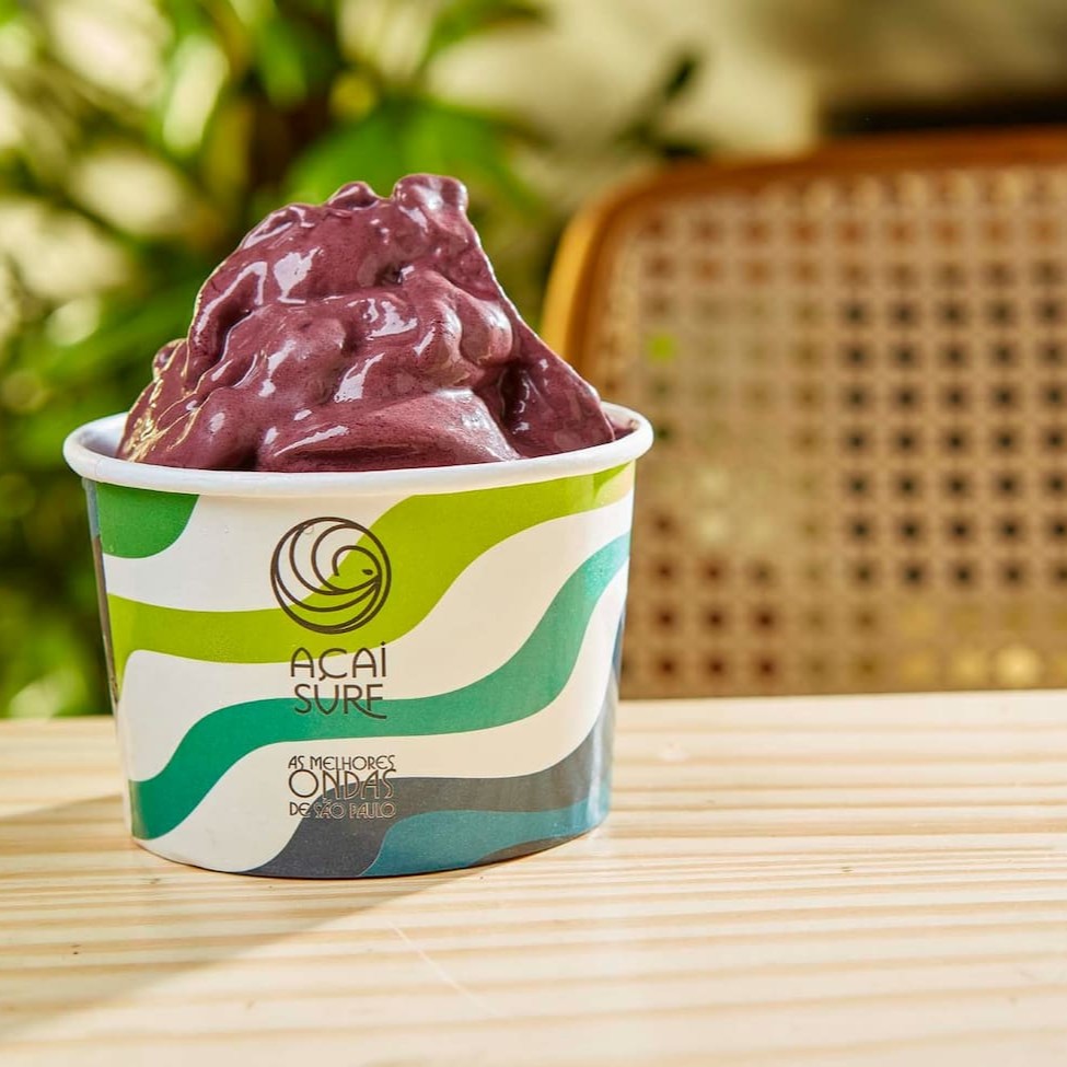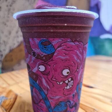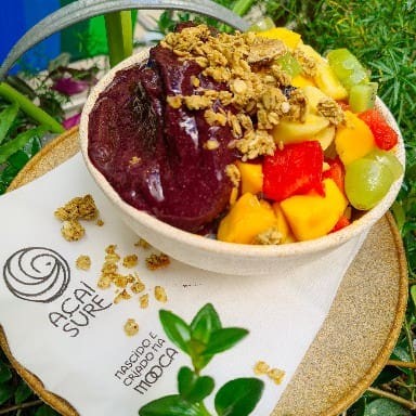 Suco de açaí bomba com Guaraná da Amazônia, amendoim, linhaça, Guaraná em pó e banana. Servido no copo de 500 ml.