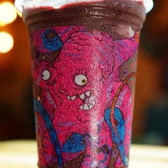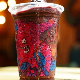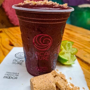 Suco de açaí bomba com Guaraná da Amazônia, amendoim, linhaça, Guaraná em pó e banana. Servido no copo de 500 ml.