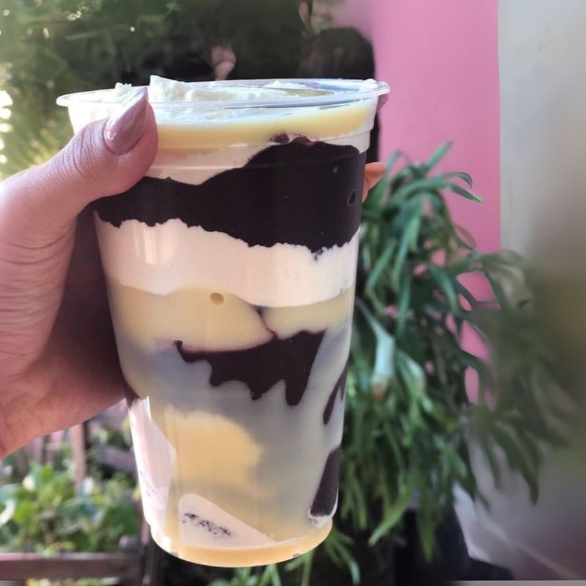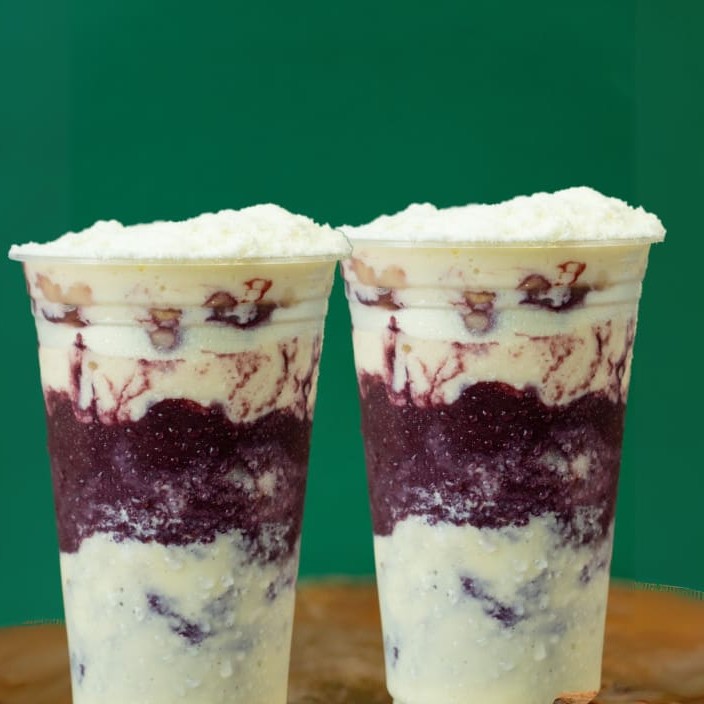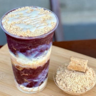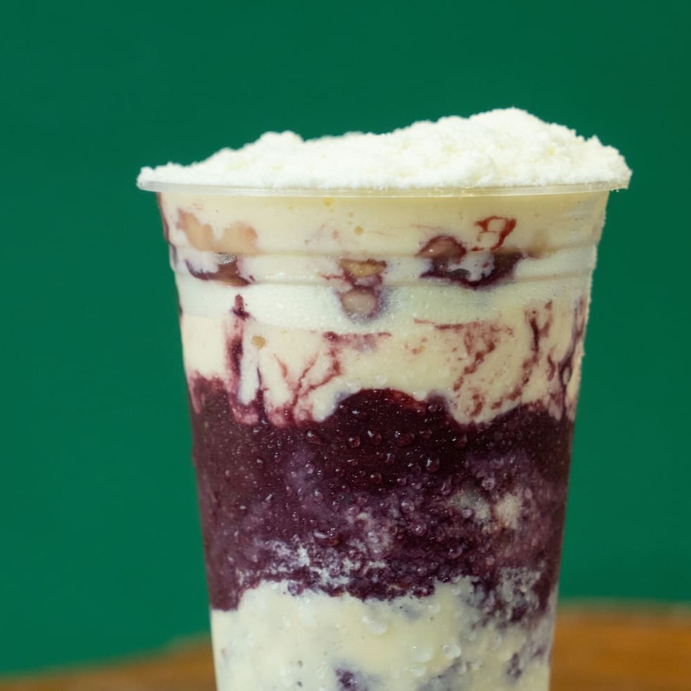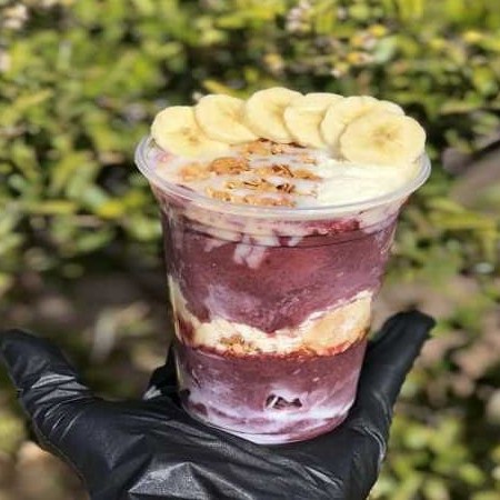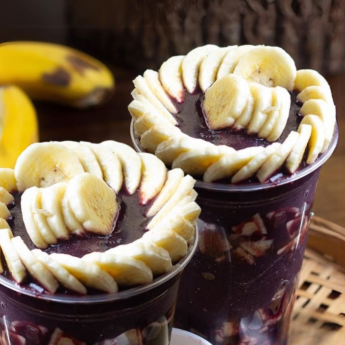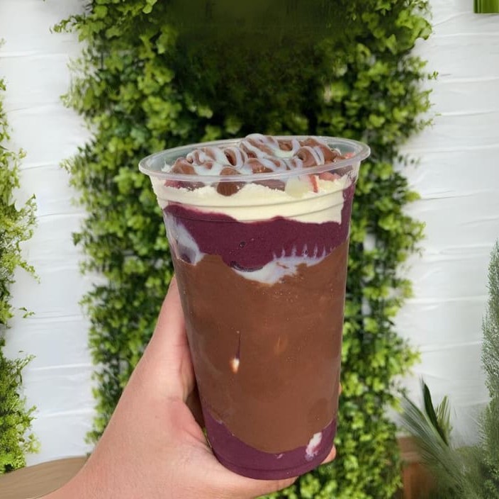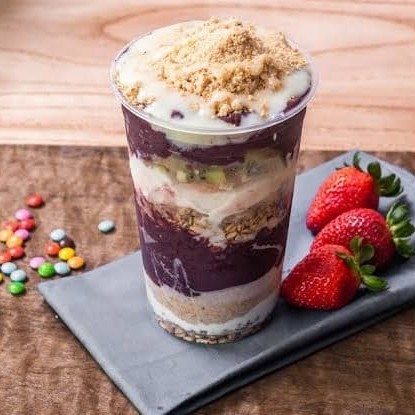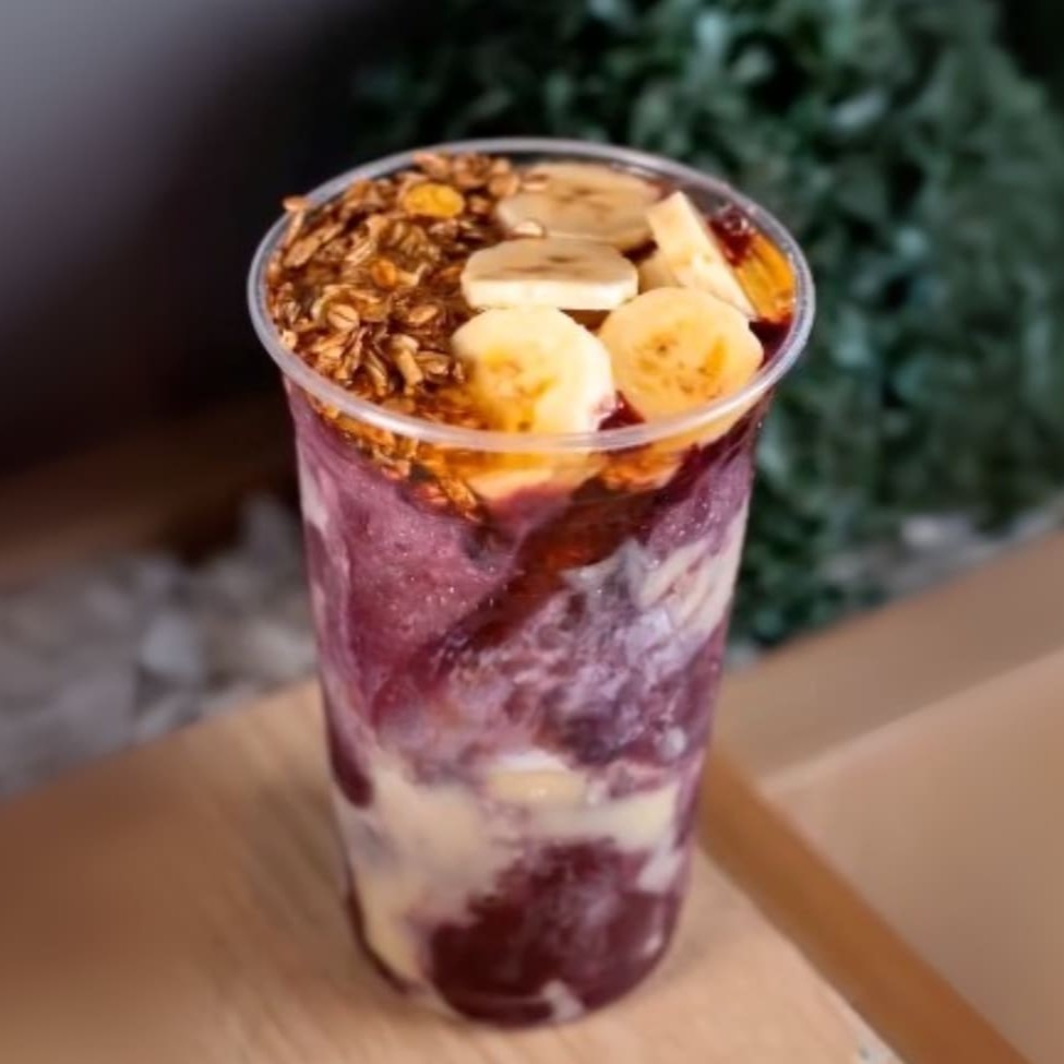 Açaí Feito no Copo com Nosso Açai Premium Super Cremoso Acompanhado de Banana Fresca, Leite Ninho, Leite Condensado e Granola.