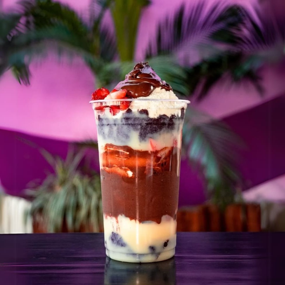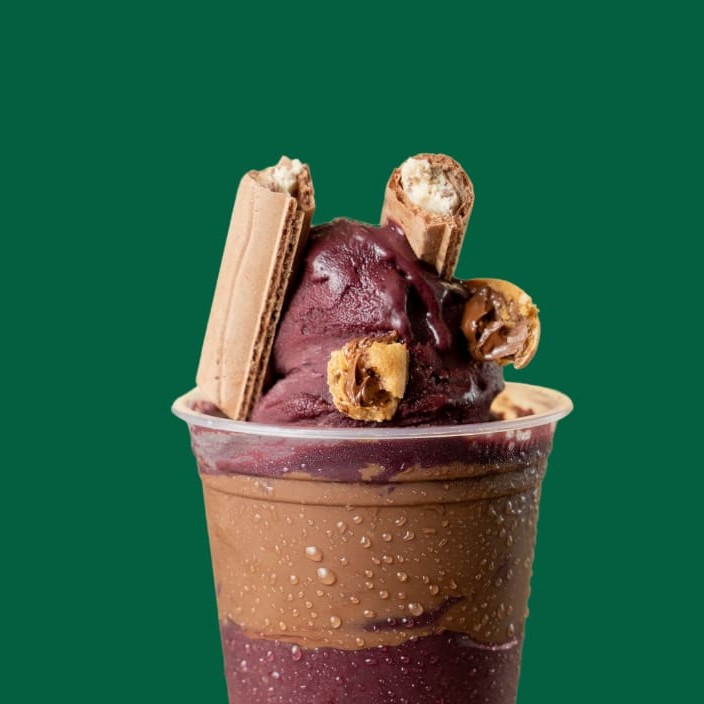 Cremoso Açaí Premium com generosa camada de creme de brigadeiro, Leite Ninho e morangos frescos. Doce refrescante e irresistível!