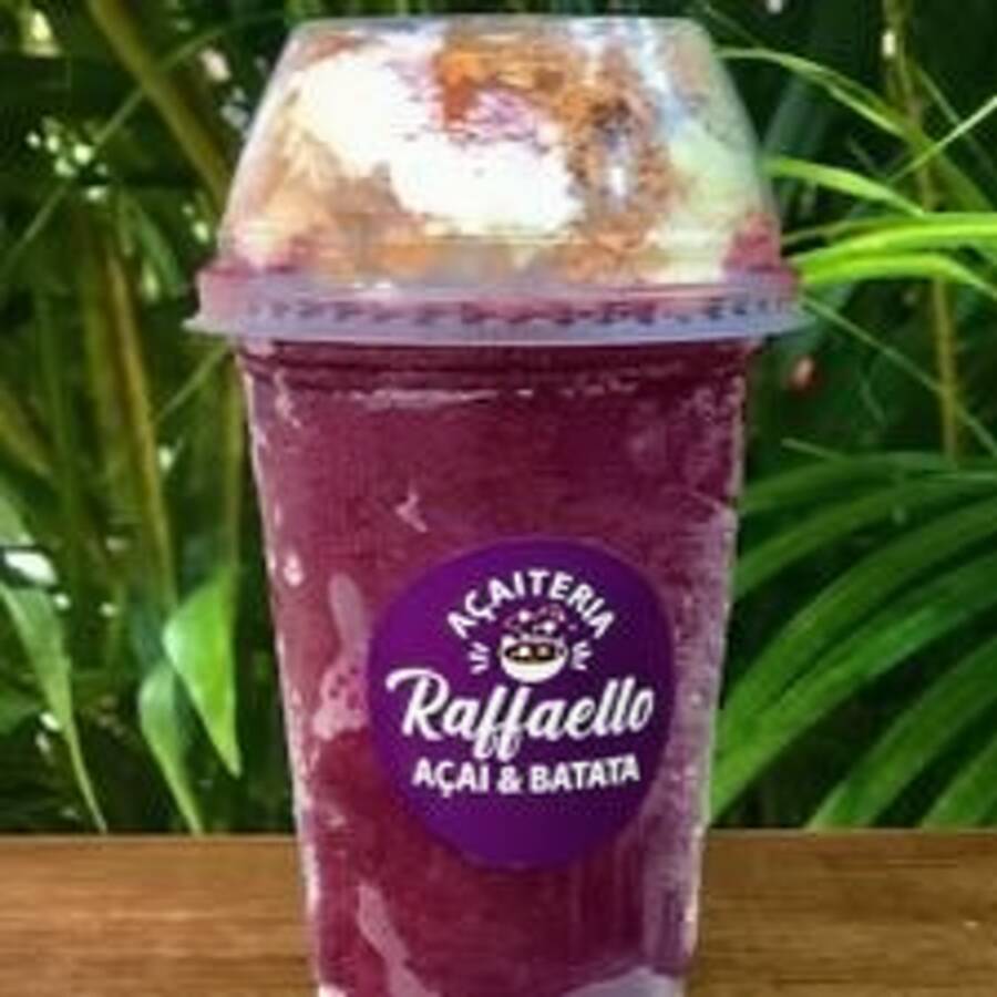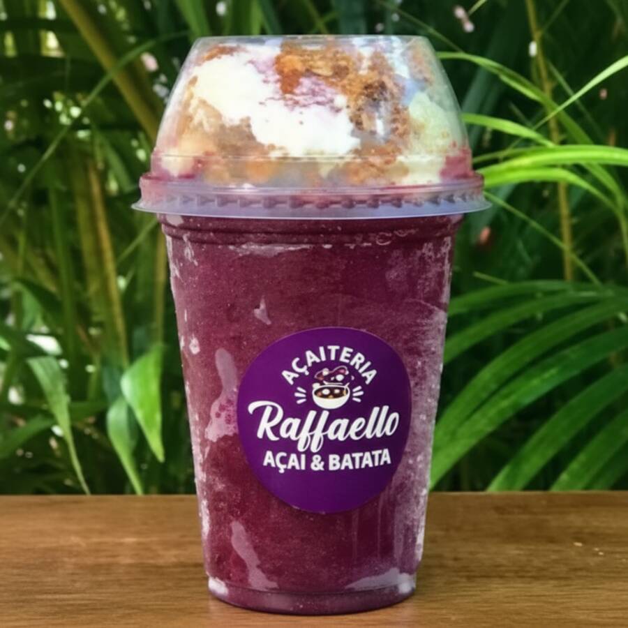 Açaí trufado com creme de raffaello. Acompanha: 5 frutas e 5 acompanhamentos.