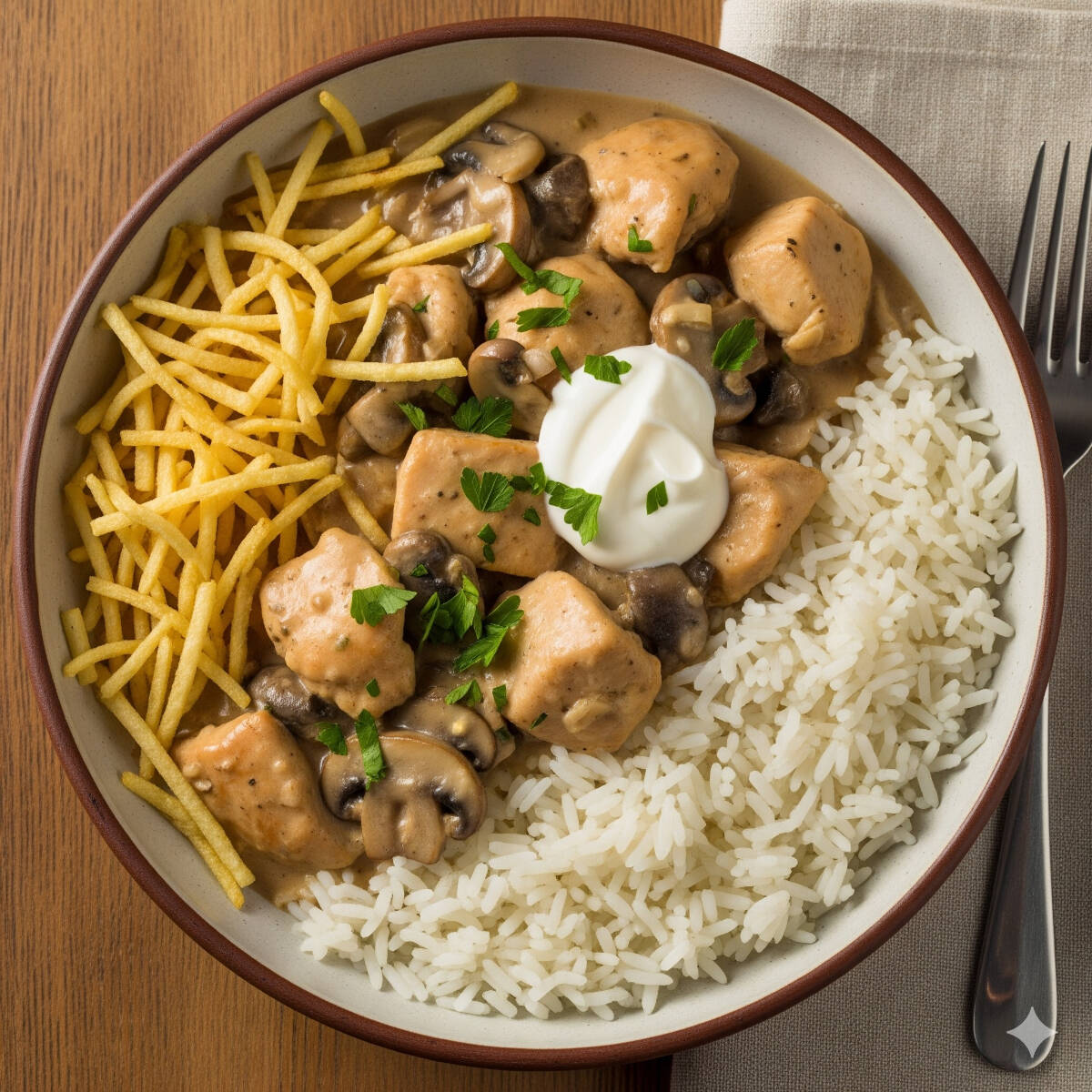 Estrogonofe De Frango Com Arroz E Batata Palha