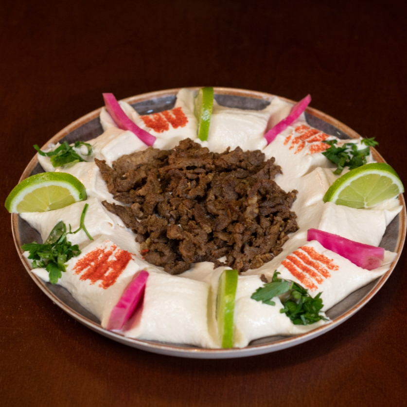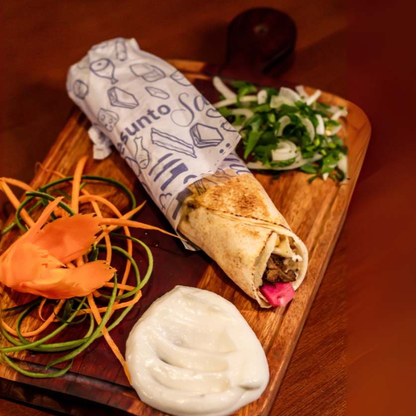 Lanche de shawarma de carne fatiado , servido com salada de repolho fresca, batata frita crocante e pasta de alho