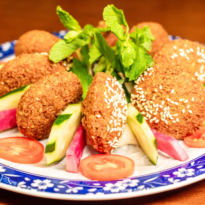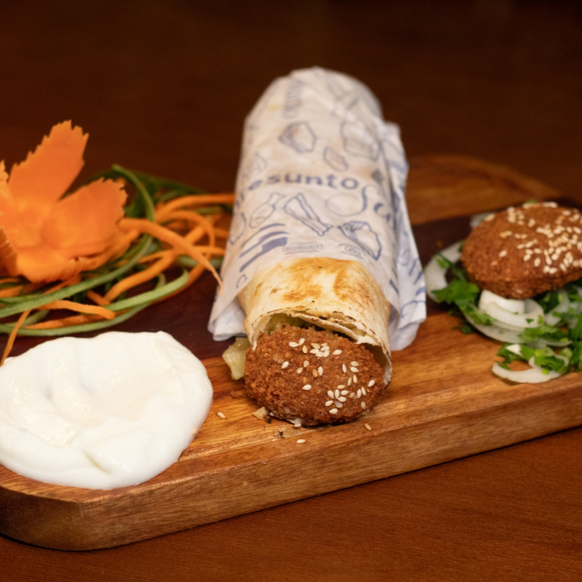 Lanche de falafel fatiado , e salada de repolho e patata frita