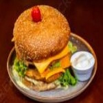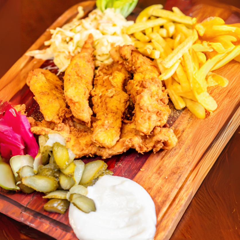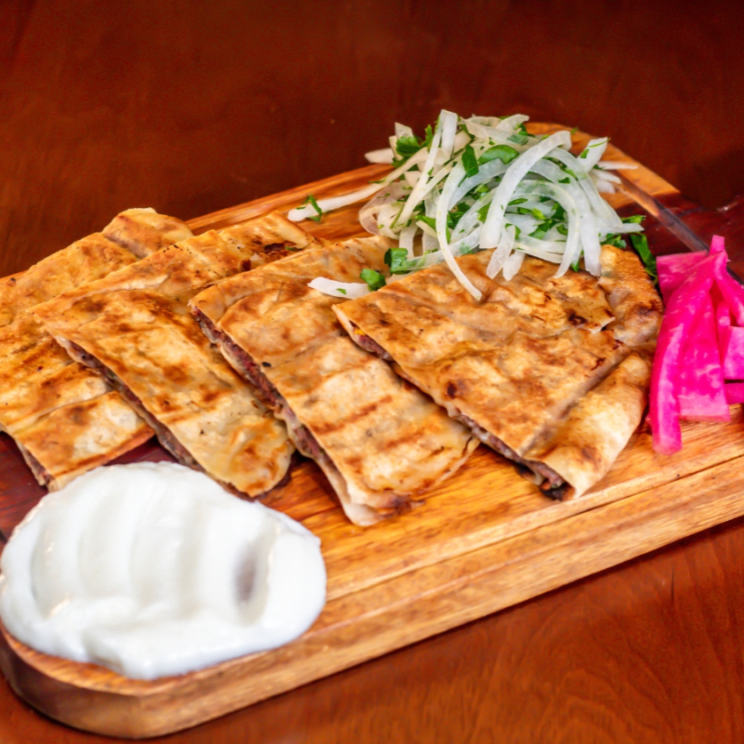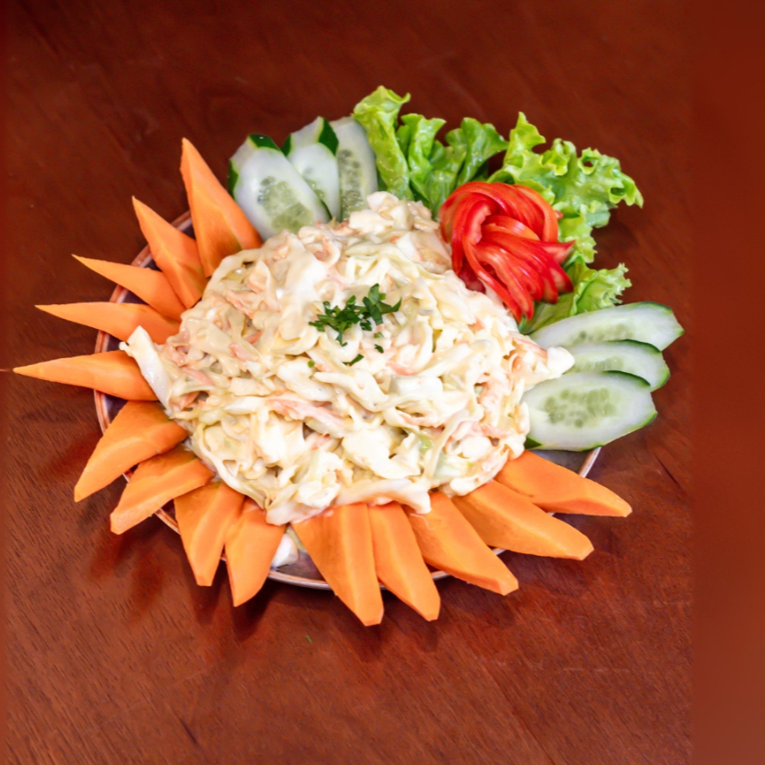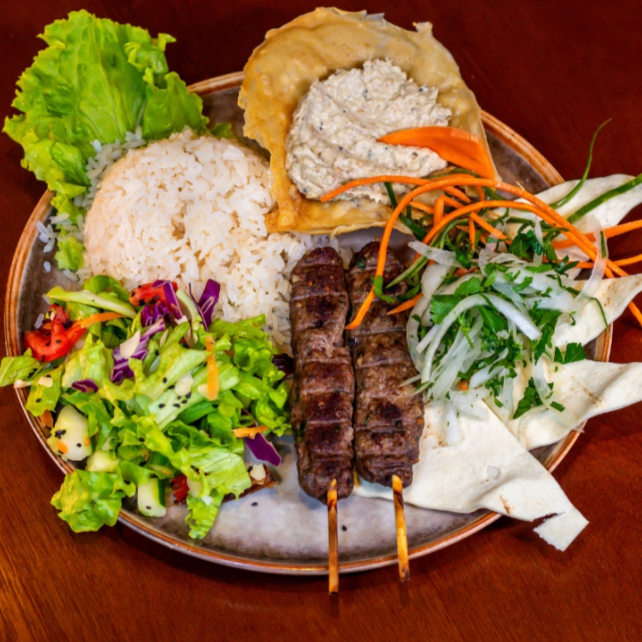 Lanche de kafta fatiado ,batata frita , salada de repolho , pasta de alho