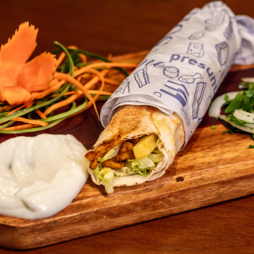 Lanche de shawarma de frango fatiado acompanhado de salada de repolho , batata frita dourada e pasta de alho .