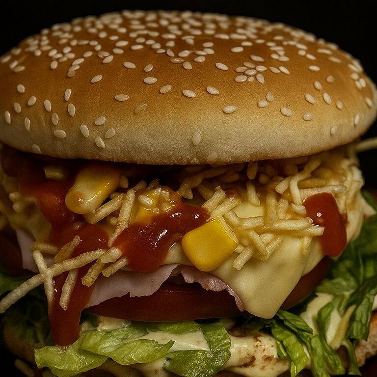Pão com gergelim, hambúrguer, queijo prato, presunto, maionese, ketchupbatata palha , milho, alface e tomate #monizhamburgueria #botecomoniz #lanche