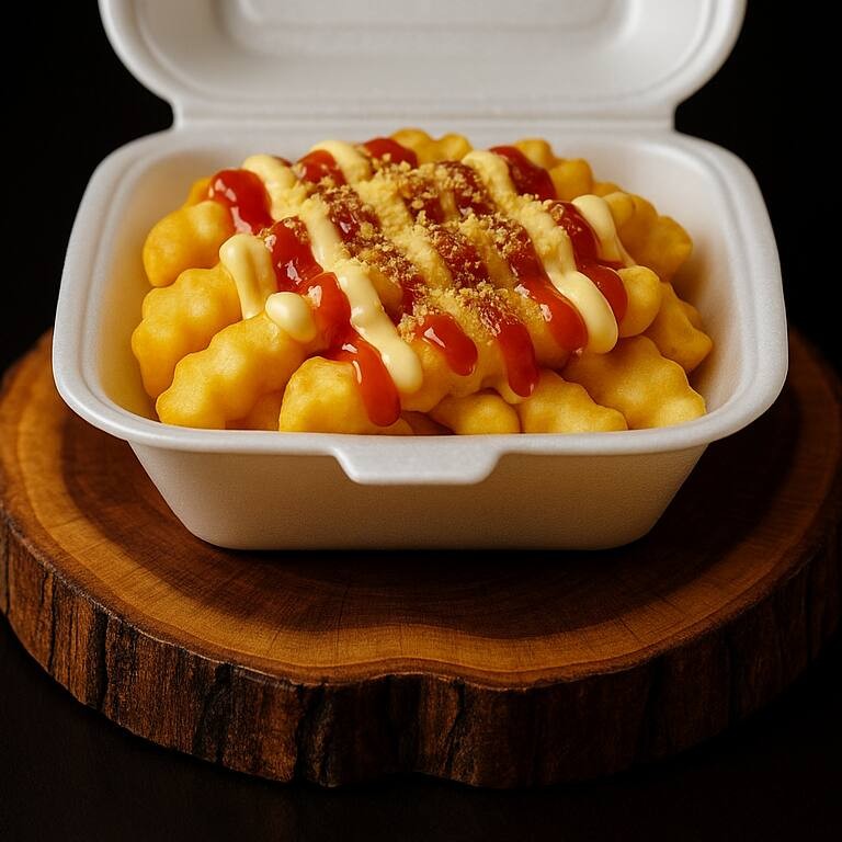 Batata Crinkle , maionese, ketchup e cheddar
