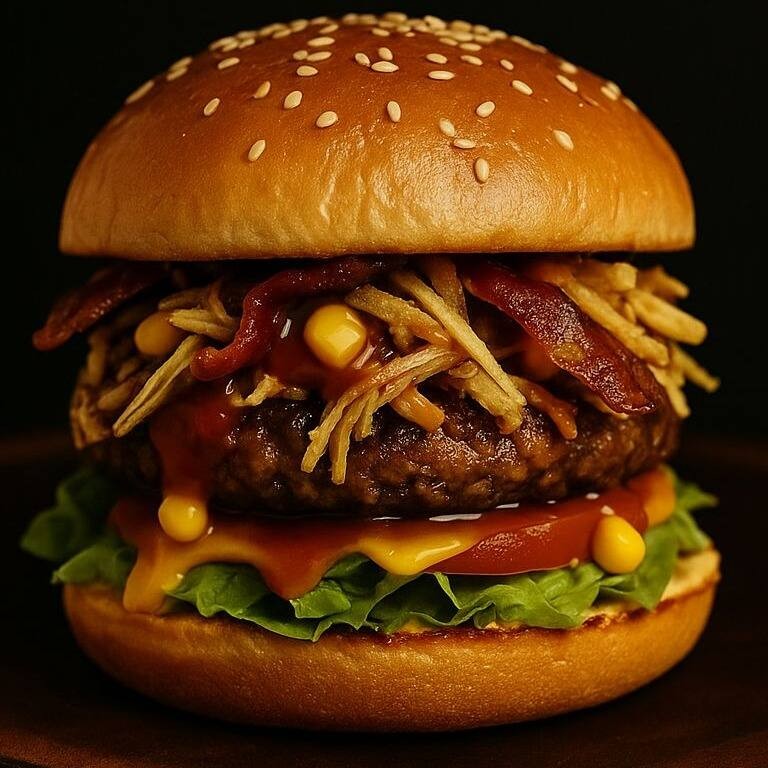Pão ( 3 Opção ) Hambúrguer , Queijo prato, Presunto, Tomate, Alface, Bacon cubo, Molho da casa 3, ketchup, Batata palha , Milho #monizhamburgueria #botecomoniz #lanche